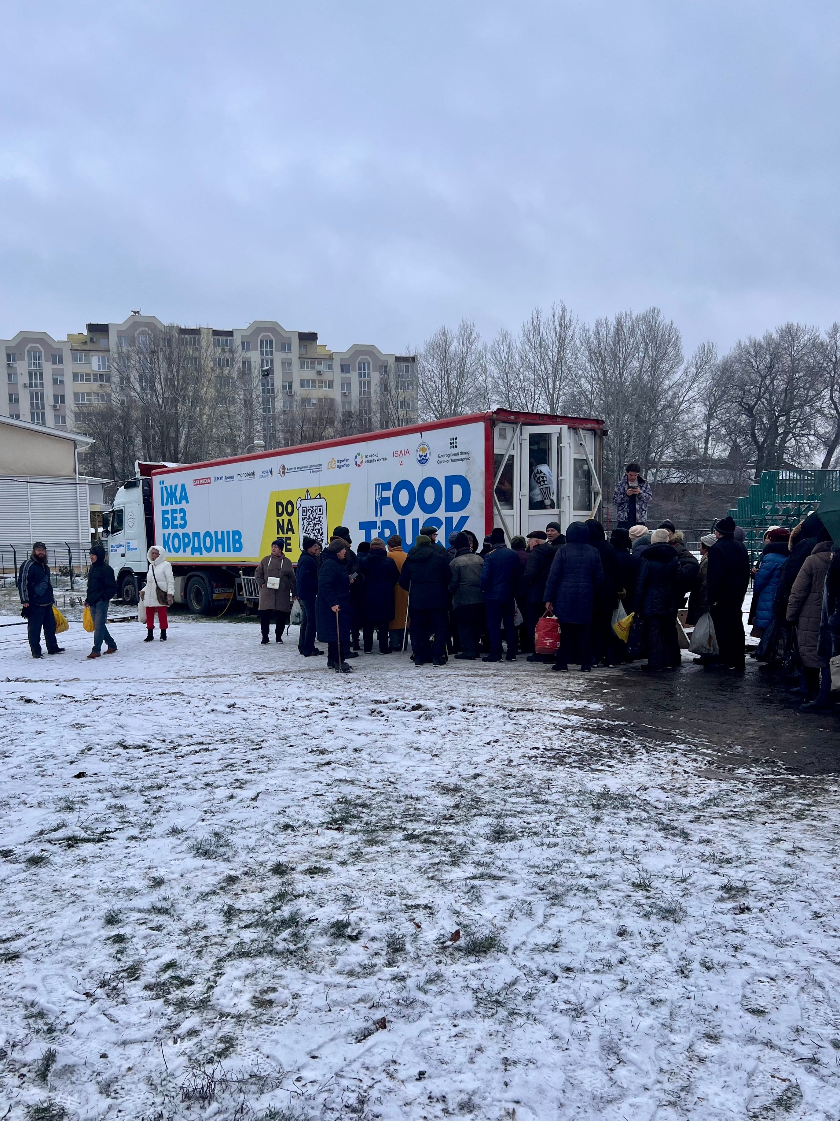 In a snow covered park in the centre of Sumy in eastern Ukraine, there was the sound of Christmas music coming from a large lorry painted with the slogan ‘Food Truck’ along the side. Inside, chef Oleg Bibikov and his small team of cooks and helpers from his Iskra Dobra charity were busy baking more than a thousand Christmas cakes and decorating them with Swiss meringue frosting and brightly coloured sugar, to give away to local elderly people and families displaced by the fighting near the border, just a few miles away.
