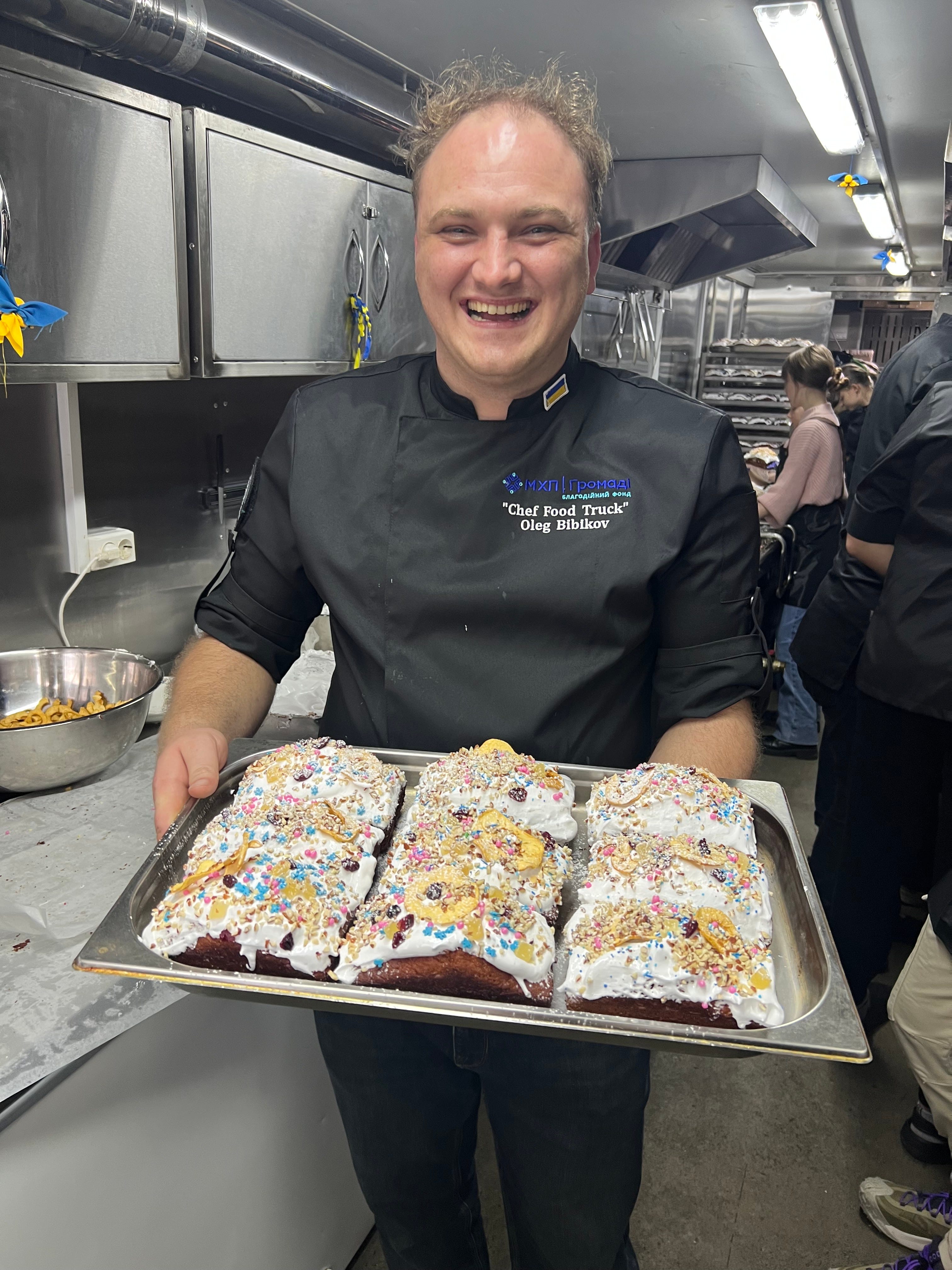 Meet chef Oleg Bibikov and his charity food truck team as they bake over a thousand Christmas cakes for displaced people in the eastern Ukrainian city of Sumy.