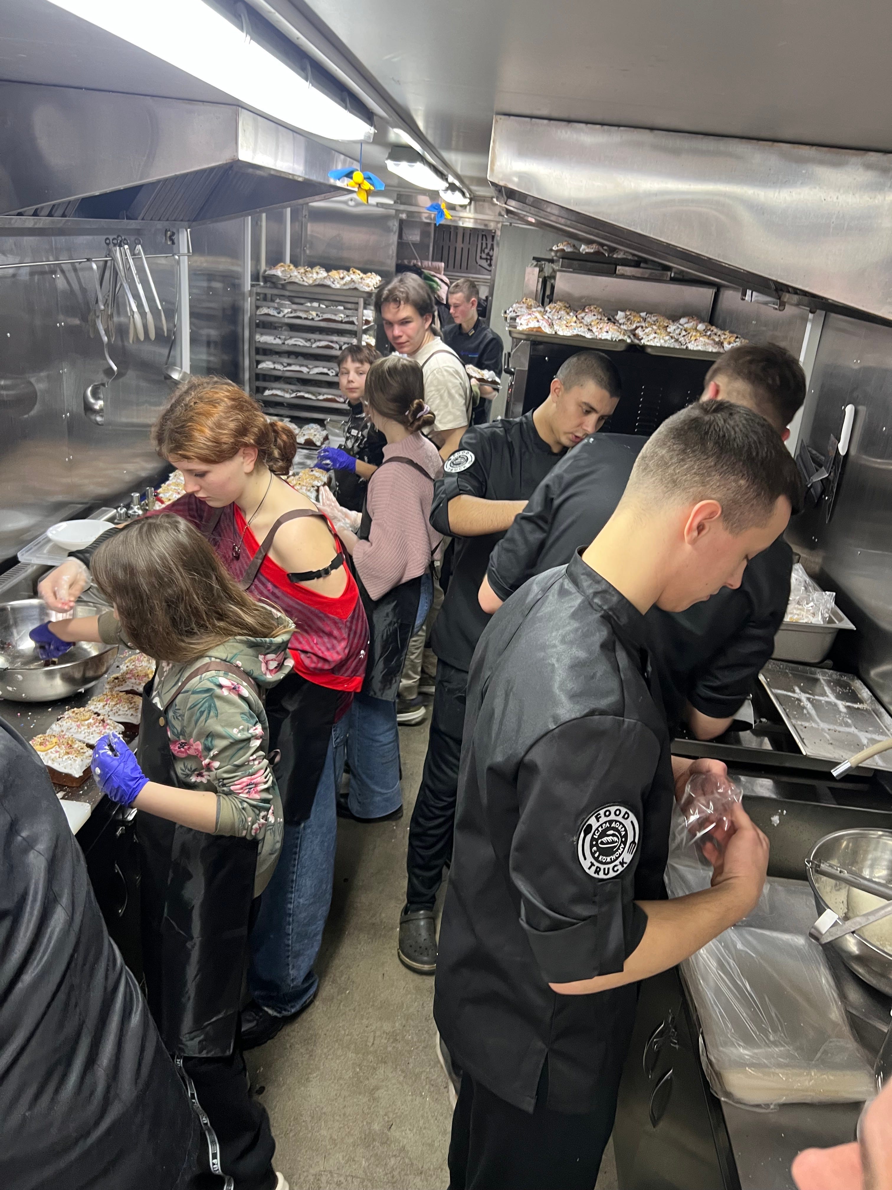 We heard Oleg’s truck before we spotted it, tucked away in a small clearing in the park, pumping out festive tunes. He threw open the back doors to welcome us inside, the windows fugged up with steam coming from the oven, trays of loaf cakes cooling down on racks lining the walls. There seemed to be an impossibly large number of people inside, happily pulling cakes from the oven, whipping up clouds of glossy meringue, sprinkling hundreds and thousands around. Three young chefs had joined Oleg from his Chernihiv restaurant, along with a couple of local Sumy staff. There was me, my Ukrainian friend Viktoria and translator Anastasia. Four schoolchildren arrived to help with the decorating. Oleg seized one of the cakes, still warm, and broke it up into pieces for everyone to try. “We make cakes for the people here that are the quality we would really want to eat ourselves”, he said, offering me a piece of the buttery vanilla sponge, studded with plump raisins.